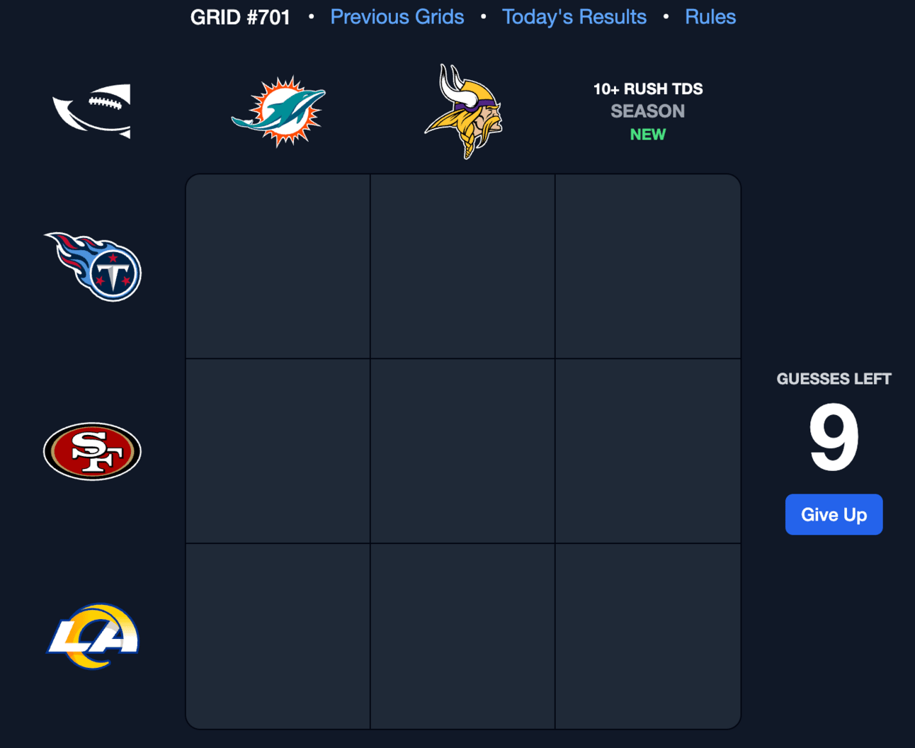 Select a player for each cell that matches the criteria for that cell’s row and column.You have nine guesses to fill out the grid.