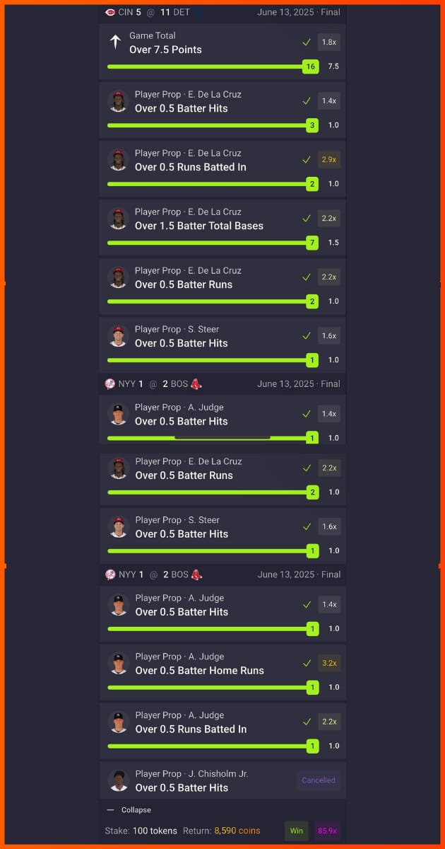 ![]() @curry>bron banked on big nights from Judge and Elly De La Cruz (and a whole lotta overs) to cash this centipede in. | ![]() @drewypotato called his shots in the NBA finals and didn’t miss — unlike all the guys he took the under’s on. |