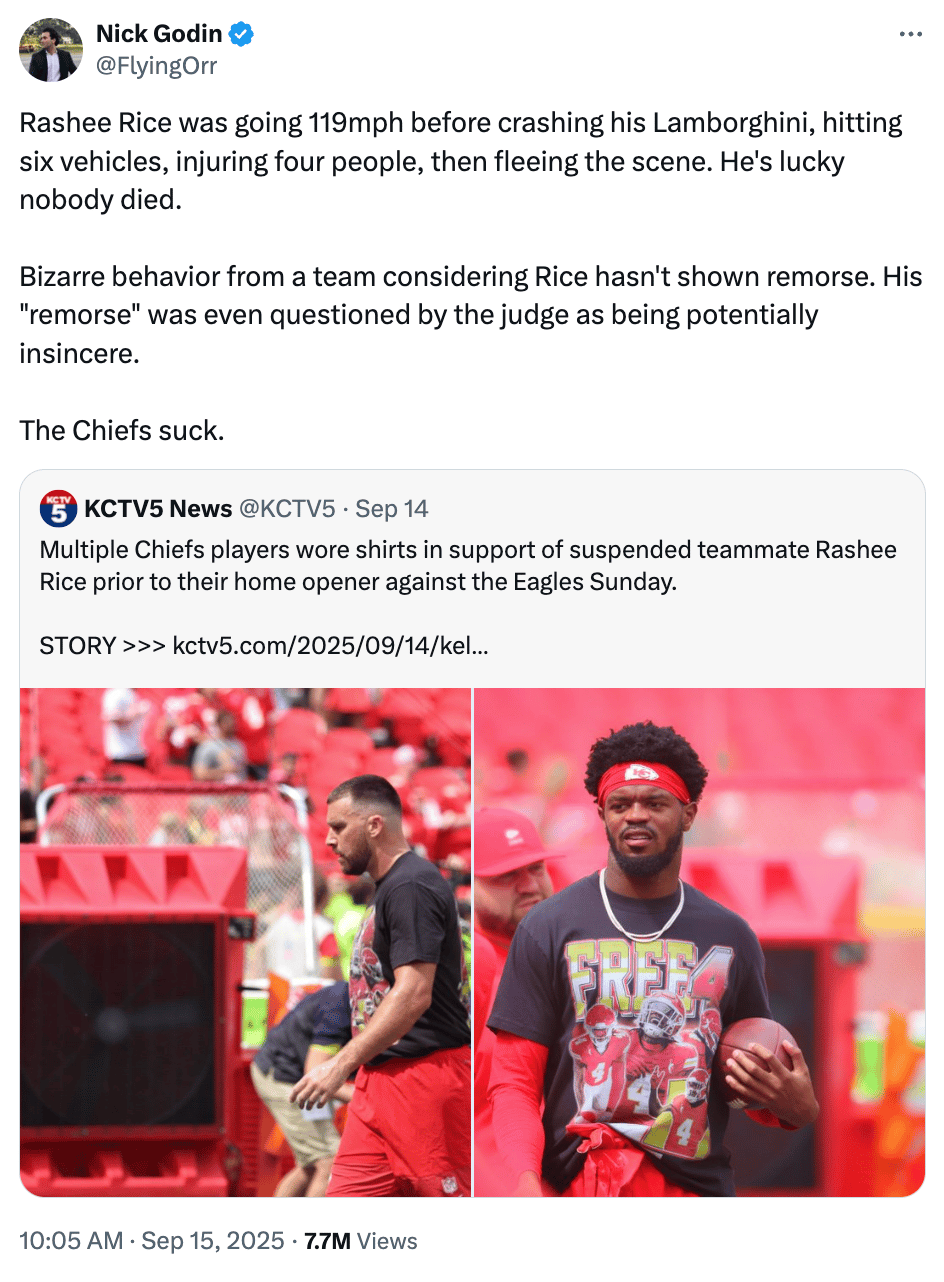 🤦♂️ Just when you think the Chiefs can’t get any more unlikeable, their players wear “Free Rashee Rice” T-shirts. Imagine acting like your teammate’s been unfairly punished after he nearly killed four people drag racing his sports car. Oh, and after he crashed his Lamborghini and caused a six-car pile up, he fled the scene.