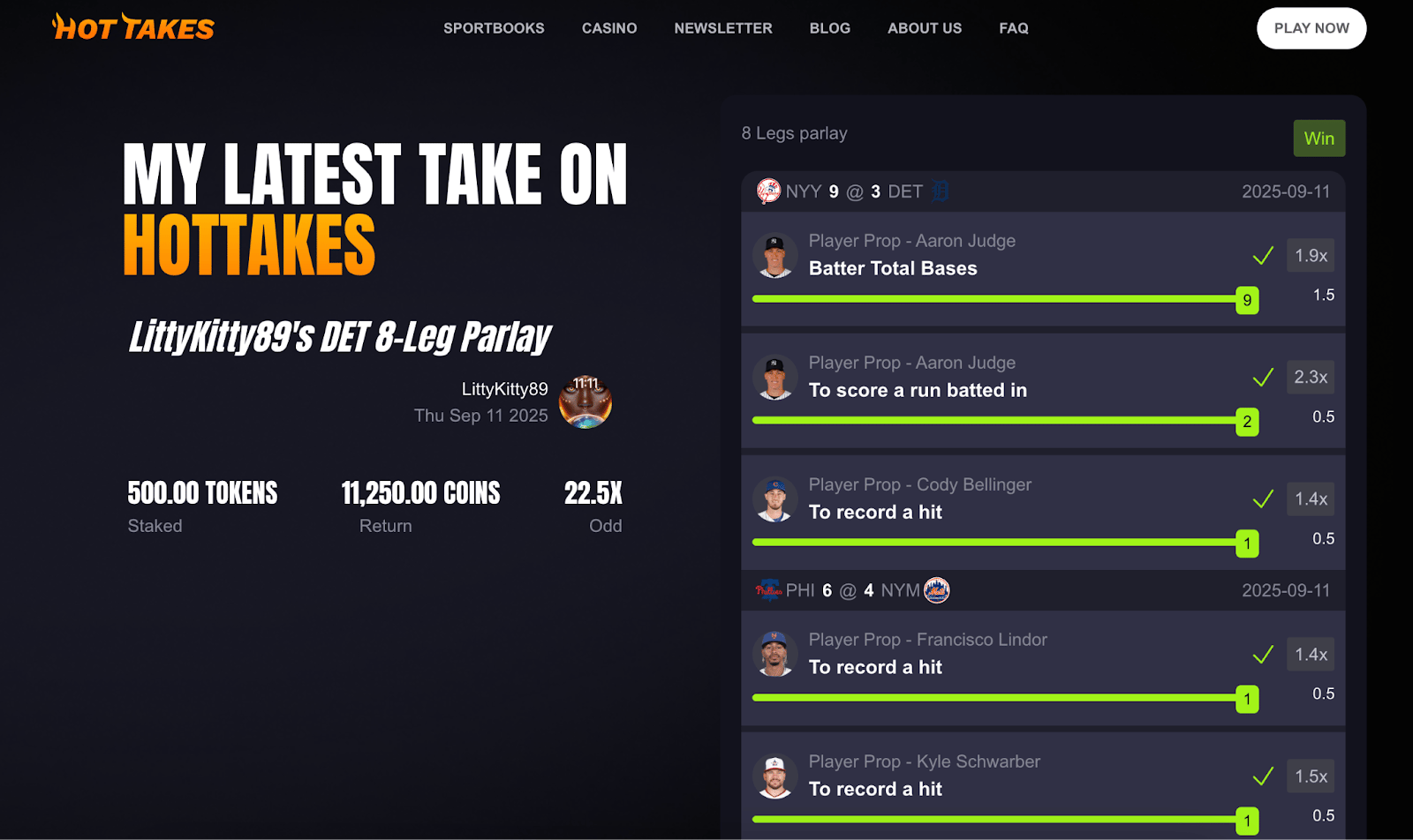 The biggest parlay of the week comes courtesy of @LittyKitt89, who nailed an 8-legger Wednesday night by taking pretty much everyone in the league to get a hit. Take Aaron Judge to get 1.5 bases? He’ll get you 9.