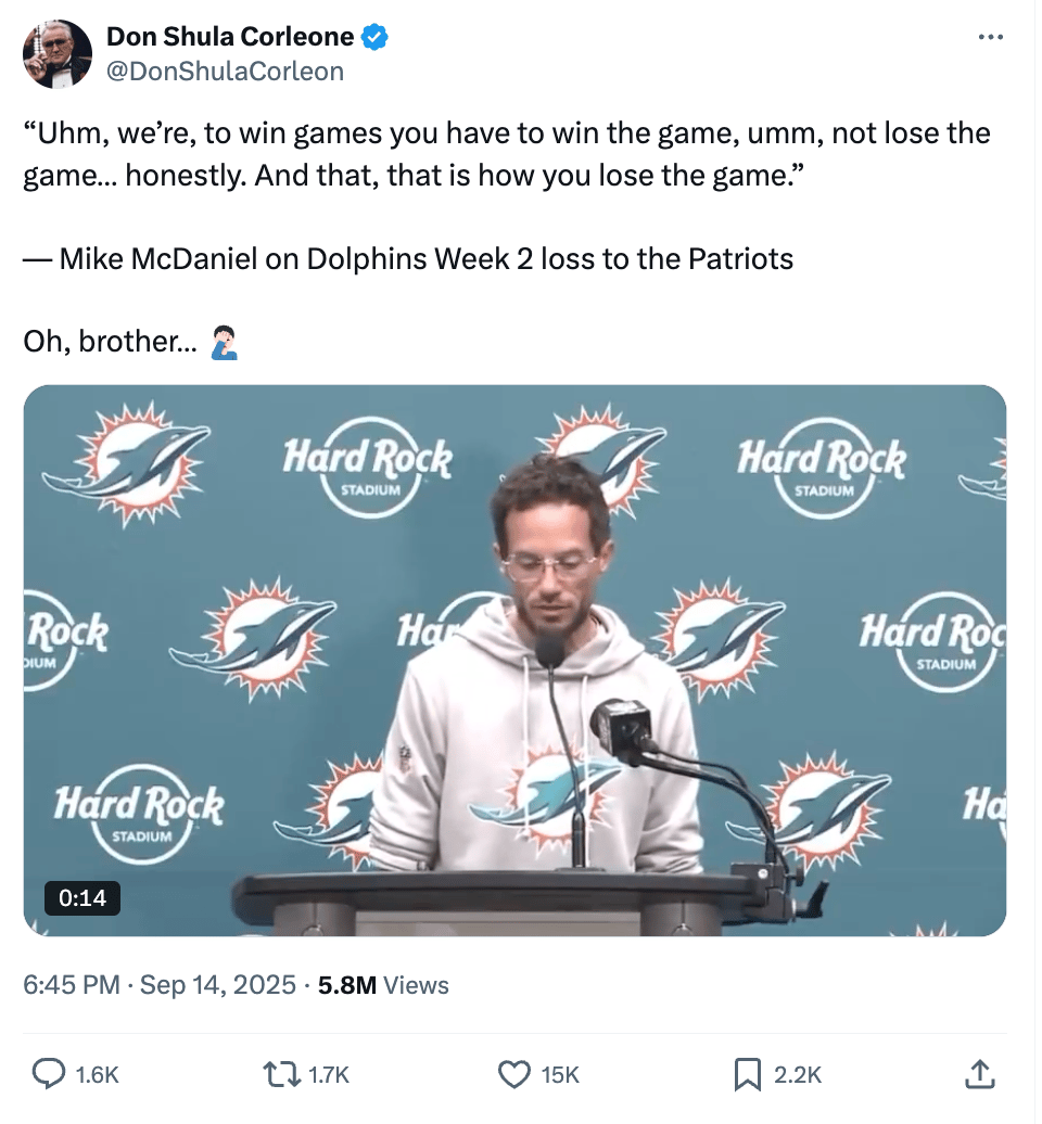 🏈 Dolphins coach Mike McDaniel gave possibly the worst post-game press conference in NFL history. To quote the man himself: “Um, to win games you have to win the game, umm, not lose the game… honestly. And that, that is how you lose the game.”