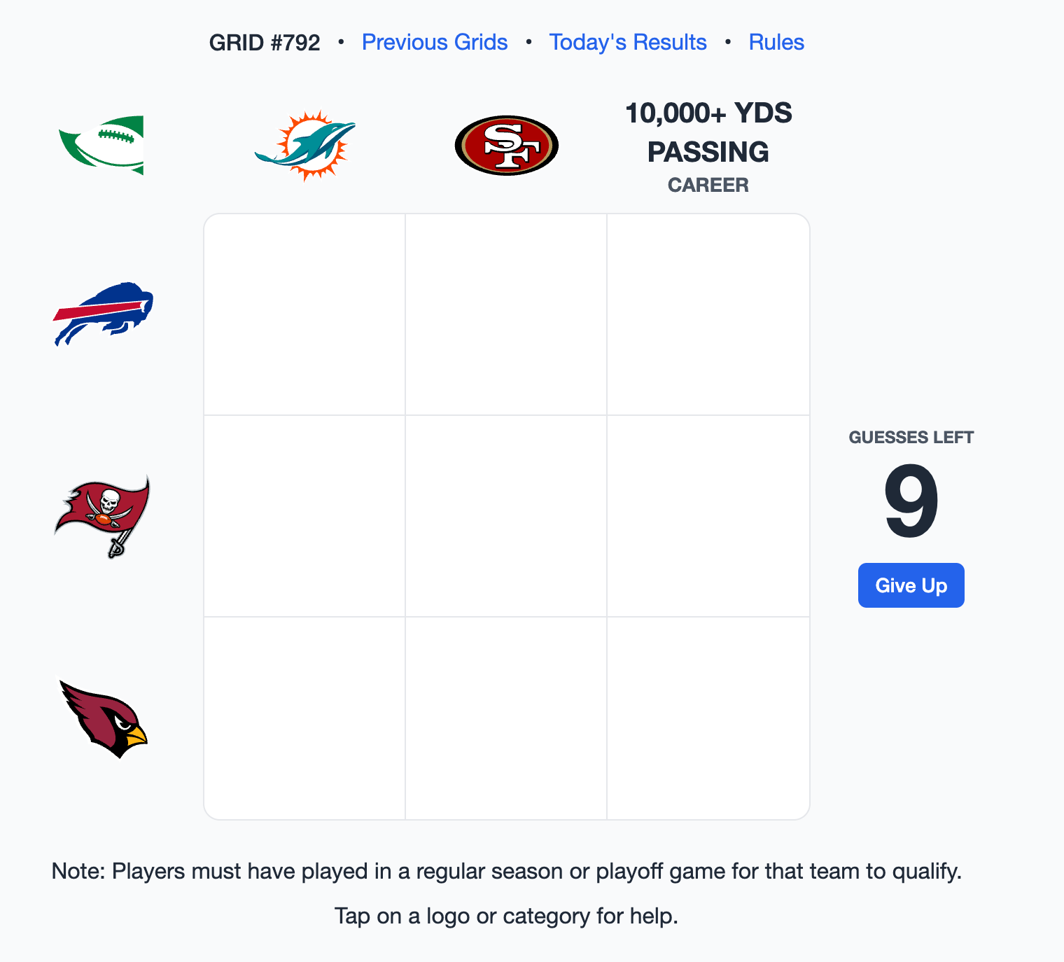 Select a player for each cell that matches the criteria for that cell’s row and column.You have nine guesses to fill out the grid.