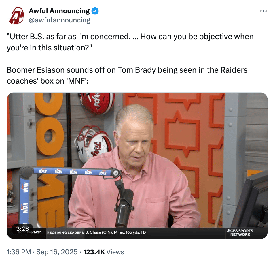 Brady’s broadcasting job wouldn’t be a problem if he was a passive owner, but this guy is meeting with the Raiders coaches 2-3 times a week to go over film and game plans.