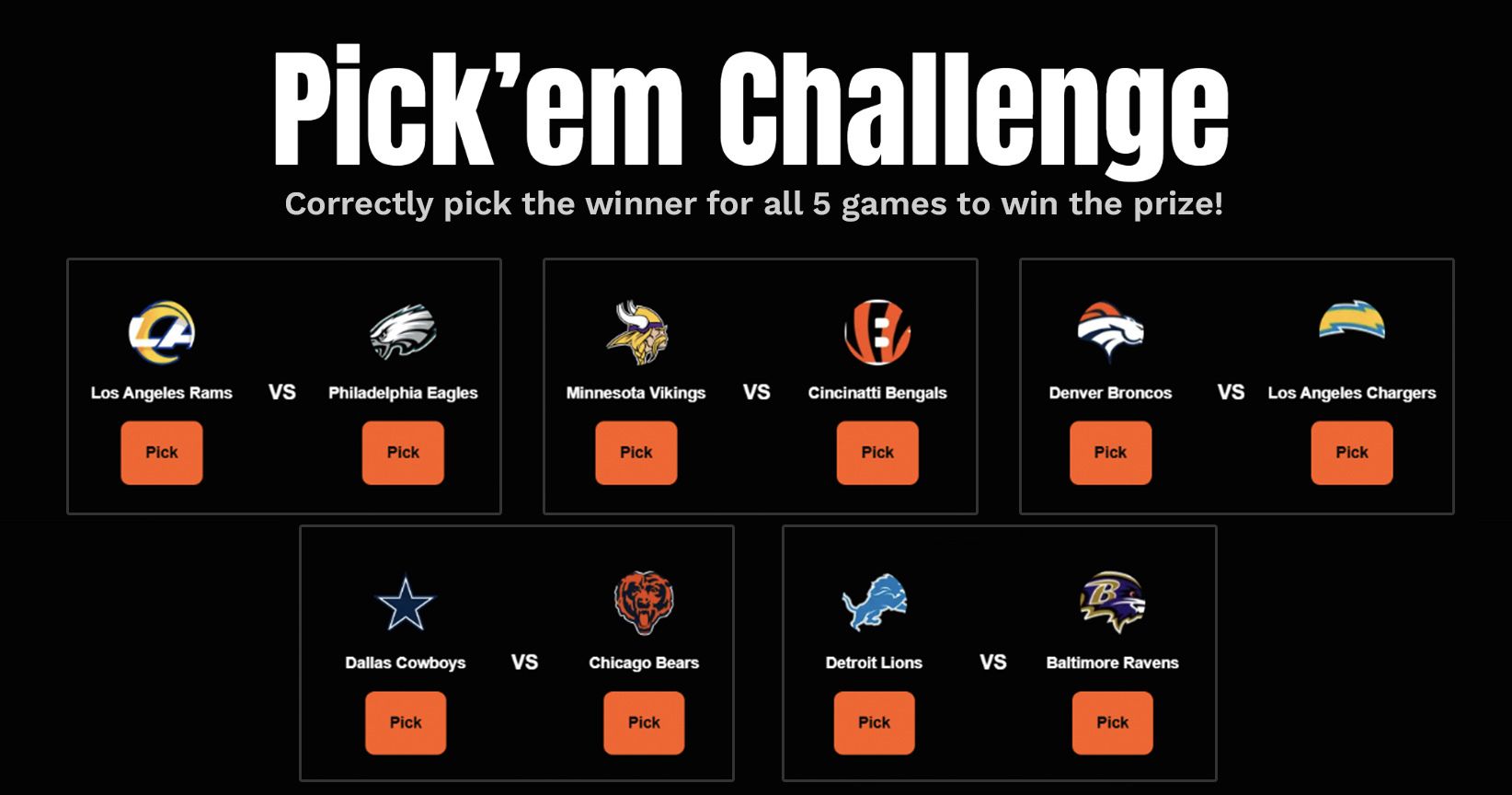 Welcome back to our weekly pick 'em game. Once again, we’re putting five $20 gift cards up for grabs for anyone who can correctly pick the winners of five games on the weekend.