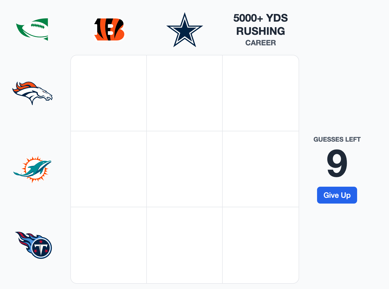 Select a player for each cell that matches the criteria for that cell’s row and column.You have nine guesses to fill out the grid.