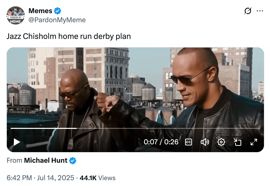 The night’s biggest loser was Jazz Chisholm, who not only failed to hit more than three home runs in the derby, but said after the fact that he was just trying to protect his swing by not putting balls in the air (an all-time cope). Safe to say the internet had a field day.