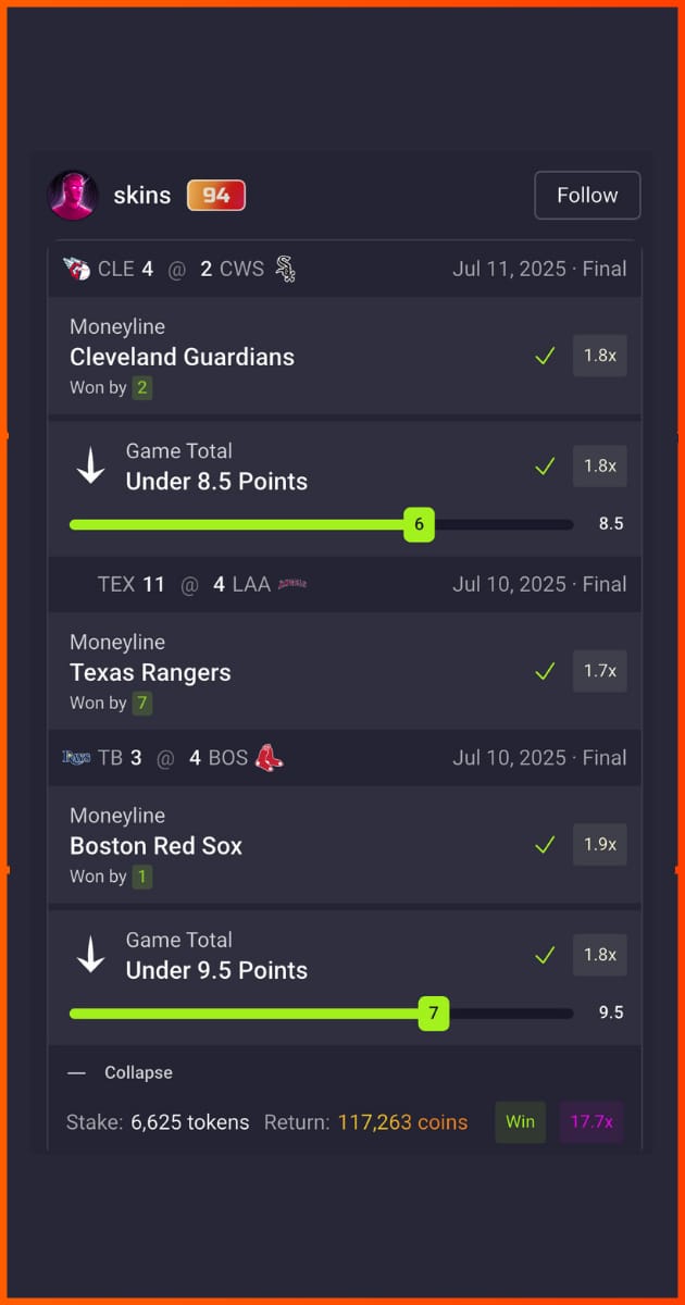 @skins hit this MLB monster right before the All Star break. Must’ve been feeling good to throw 6,500 tokens on this one. Gutty calls always (usually) pay off.