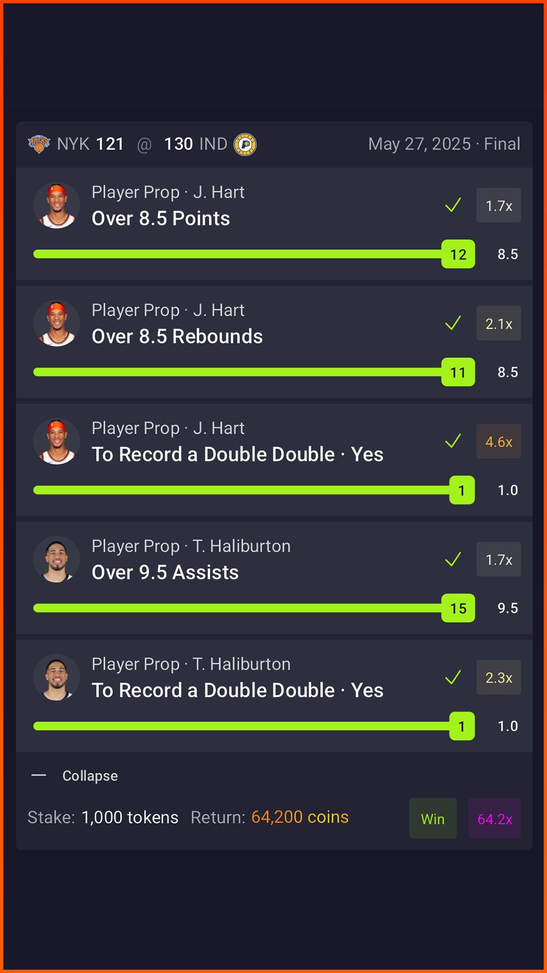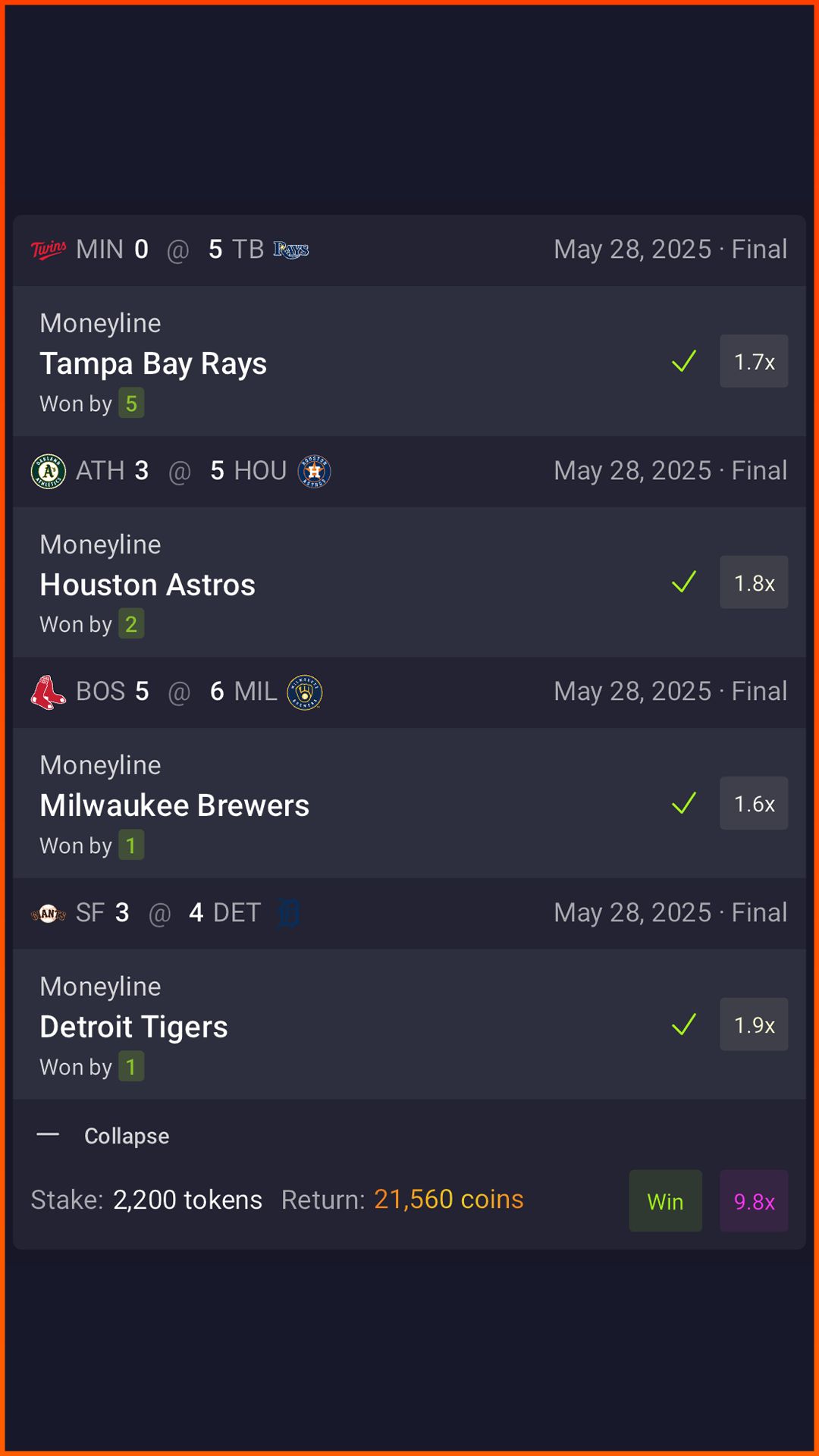 ![]() @gsethian just knows ball. Can’t say we recommend betting all overs on the same game, but hey, you can’t argue with the results. | ![]() Shoutout @teeo for his big baseball hit. Not much of a player prop guy clearly but had the M/O on moneylines that night. |