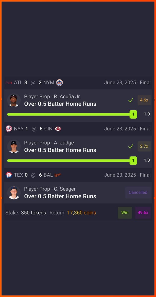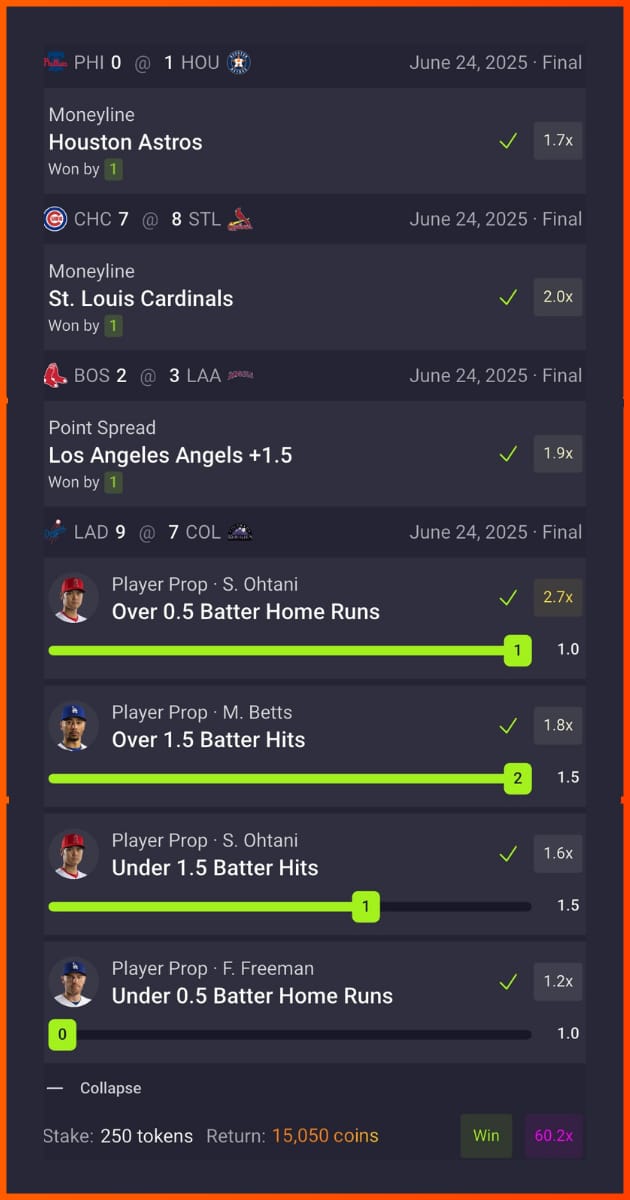 ![]() @BigVelvet21 took two of the biggest bats in the league to homer on the same day and they’ve got the 50x payout to prove their gut call was the right one. | ![]() @NeilFoCash hit a nice baseball parlay of his own, landing an outrageous seven-legger. Taking Shohei for a home run and also taking his under on hits is crazy work, but we love it. |