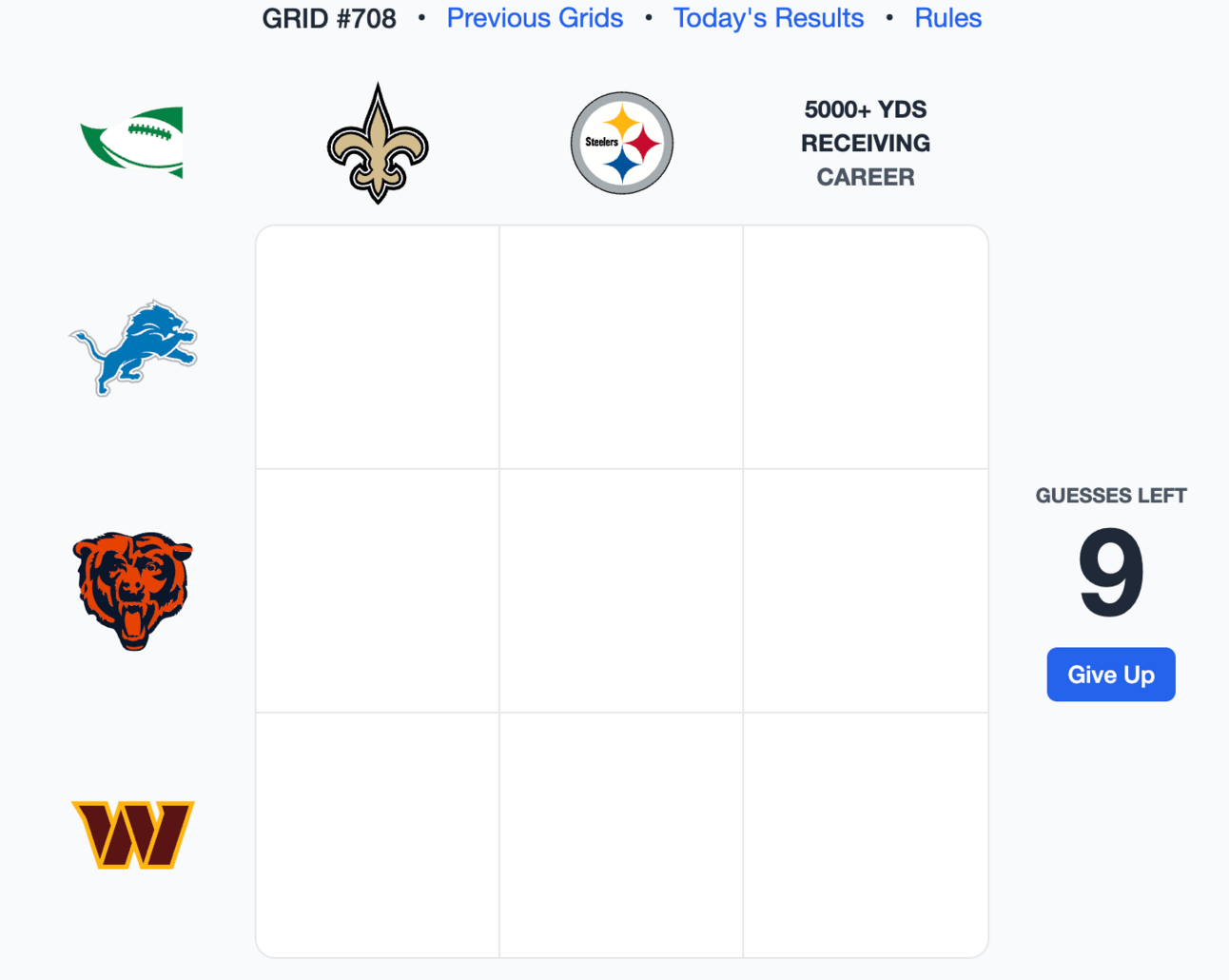 Select a player for each cell that matches the criteria for that cell’s row and column.You have nine guesses to fill out the grid.