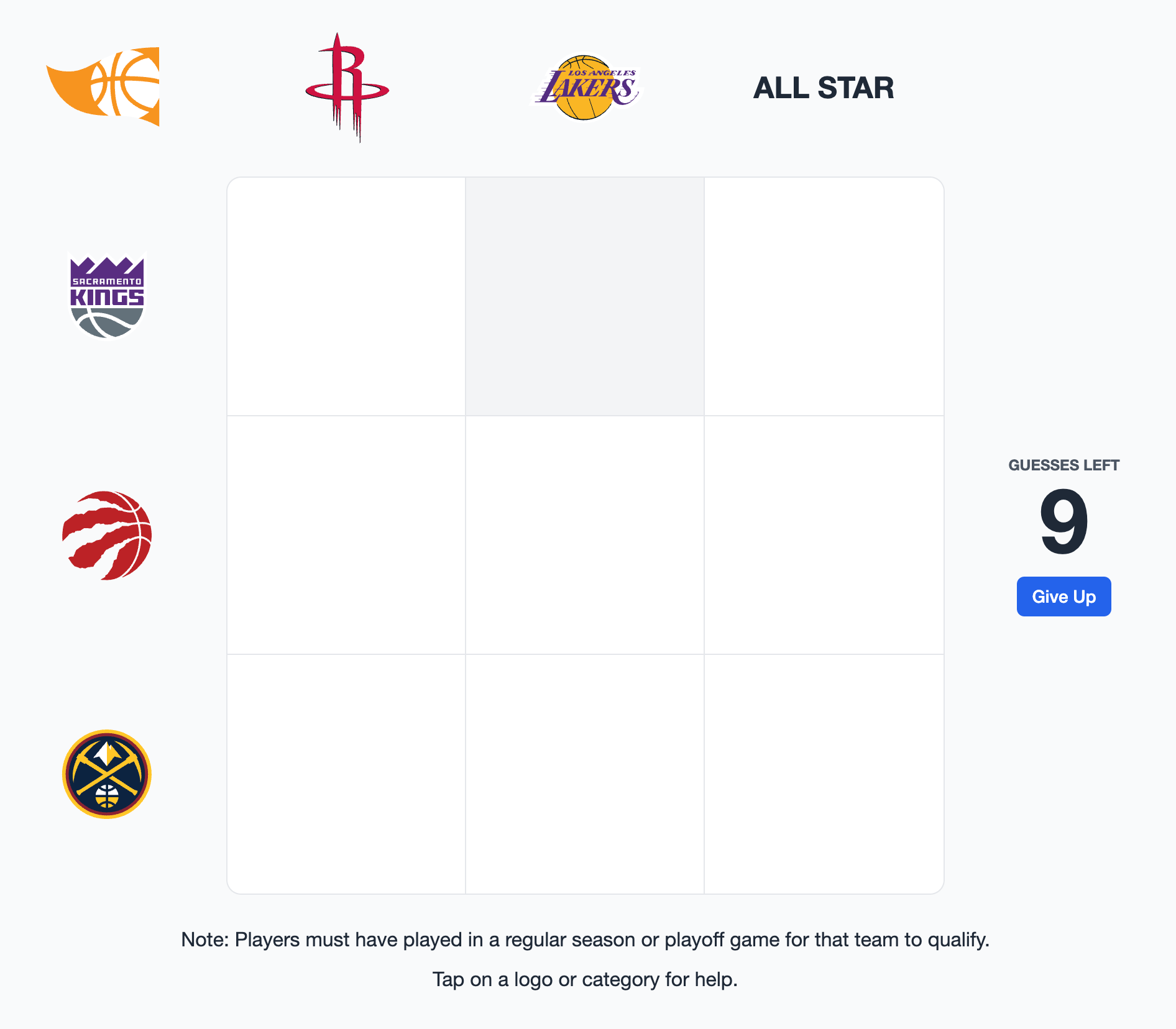 Select a player for each cell that matches the criteria for that cell’s row and column.You have nine guesses to fill out the grid.