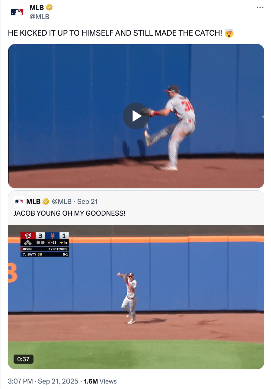 ⚾️ We got the circus catch of all circus catches this week. Nationals outfielder Jacob Young made one of the most absurd grabs you’ll ever see on a baseball field. He might be the only player in MLB history to hacky sack a fly ball into his glove for the out. Gotta love the creativity.