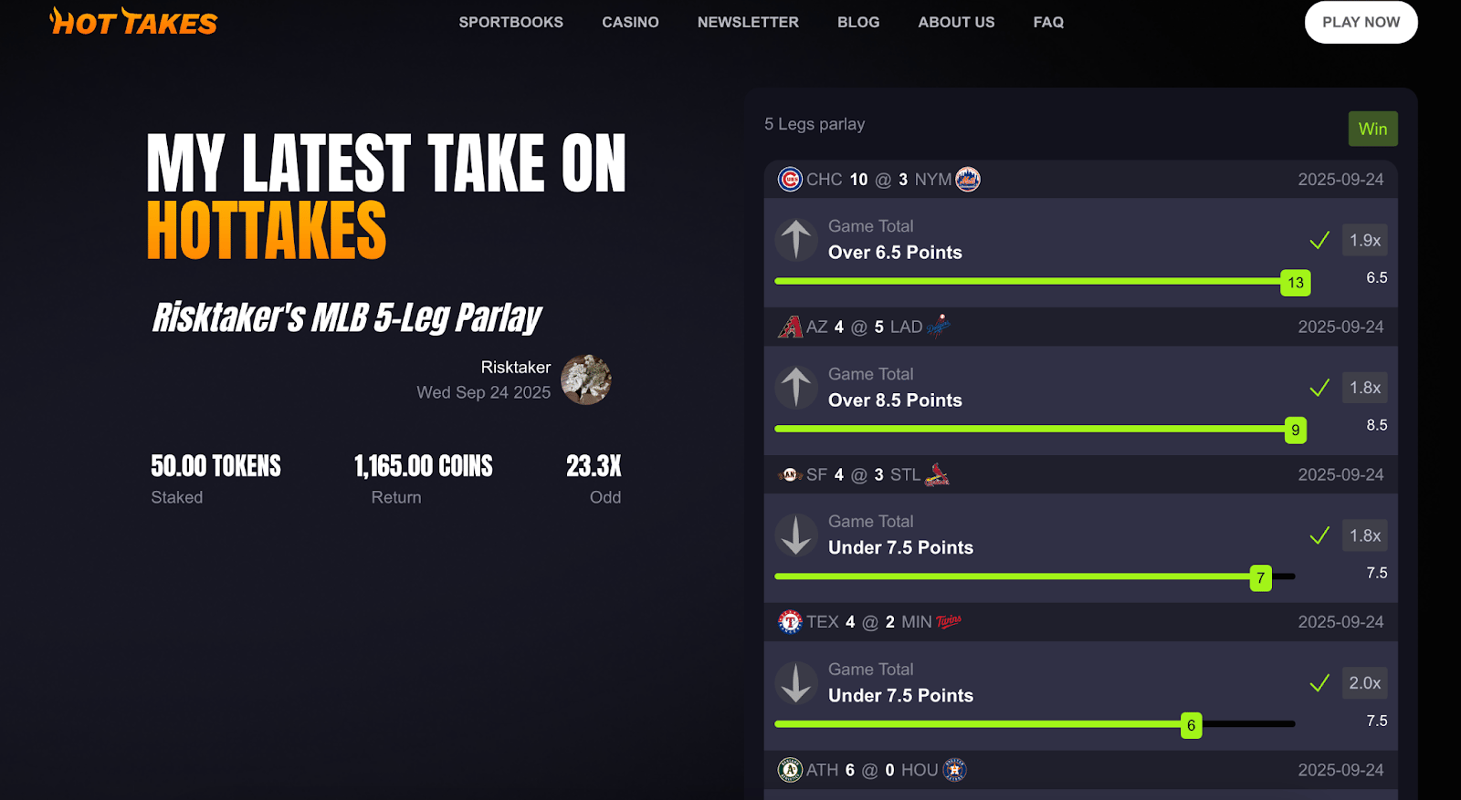 @risktaker had the biggest hit of the week, snapping off this five-leg MLB parlay on Wednesday night. Zero player props — all over/under’s. That’s one way to get it done.