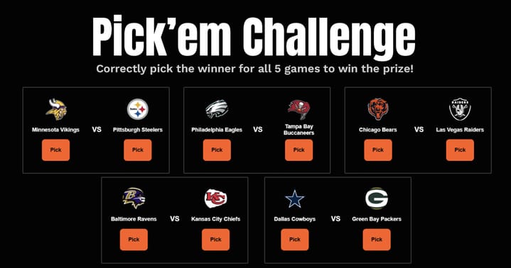 Welcome back to our weekly pick 'em game. Once again, we’re putting five $20 gift cards up for grabs for anyone who can correctly pick the winners of five games.