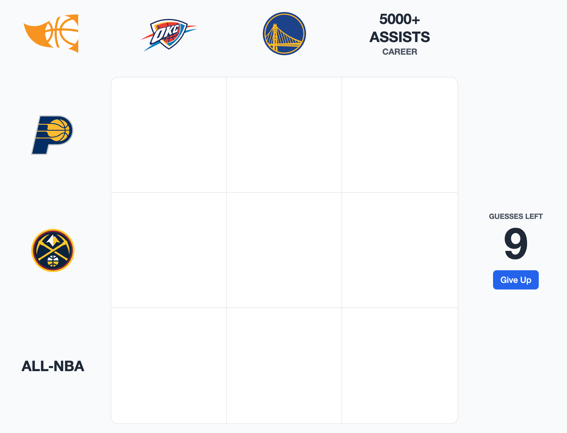 Select a player for each cell that matches the criteria for that cell’s row and column.You have nine guesses to fill out the grid.