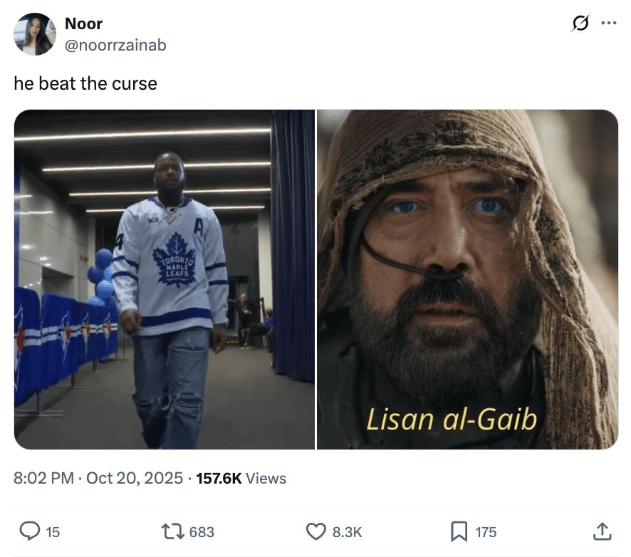 🍁 Vladimir Guerrero Jr. has ended the Leafs curse. George Springer’s 3-run homer may have sent the Blue Jays to the World Series, but Vladdy showing up to game seven in an Auston Matthews Leafs jersey (and not losing) did more for Toronto sports than most people will understand. Vlad and the Jays have killed one of sport’s most notorious curses (for now).