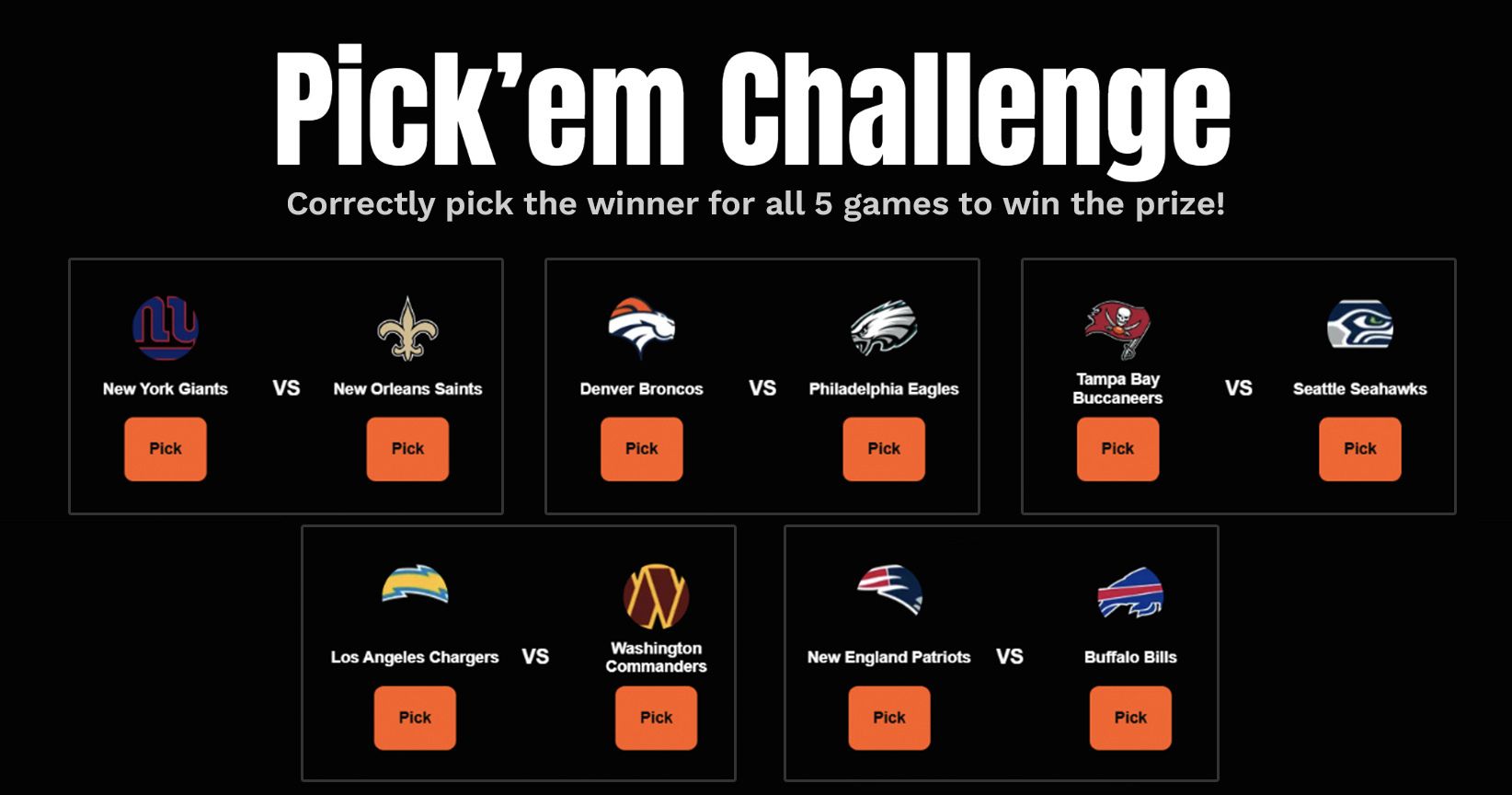 Welcome back to our weekly pick 'em game. Once again, weāre putting five $20 gift cards up for grabs for anyone who can correctly pick the winners of five games.