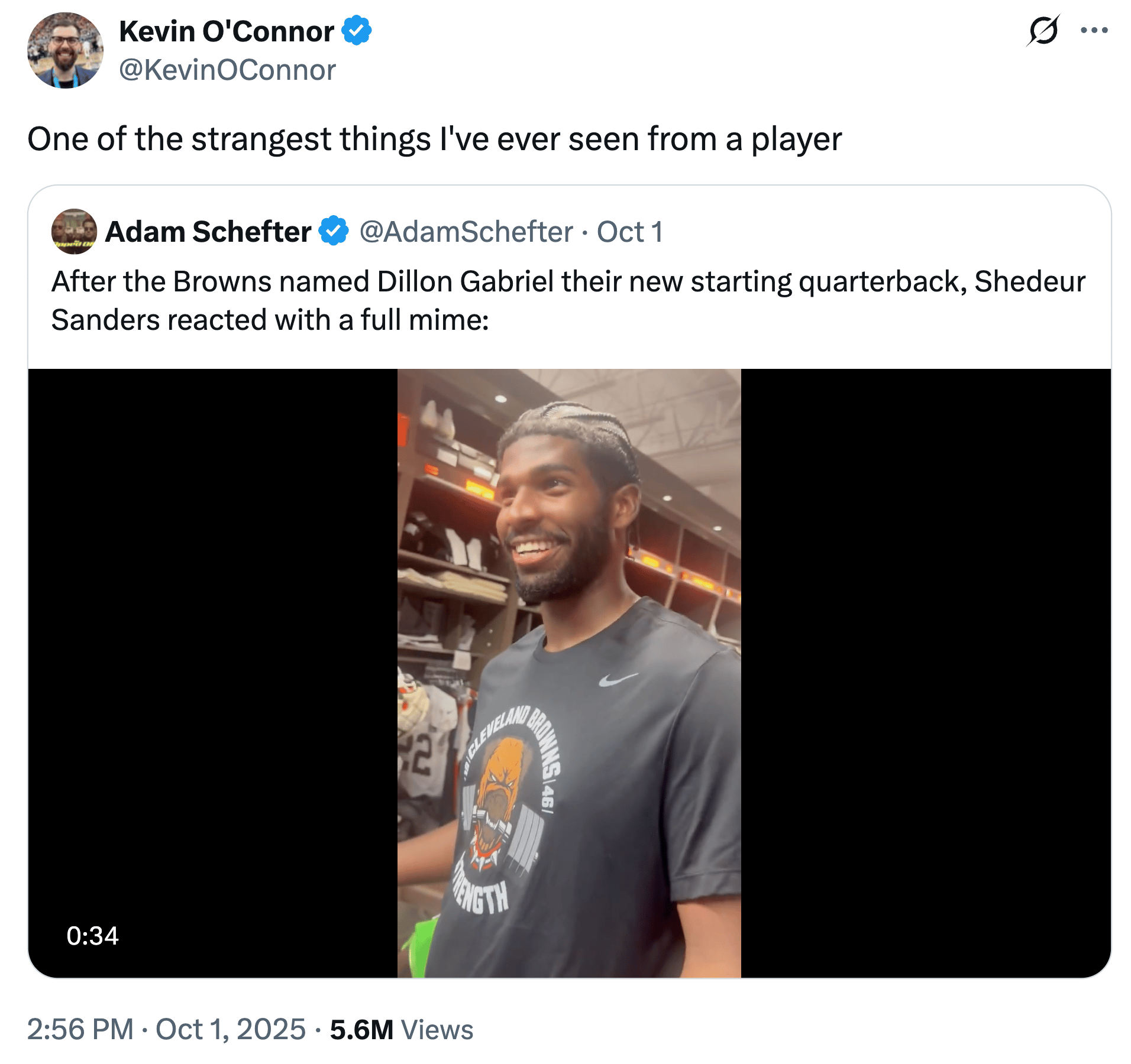When he was asked about Dillon Gabriel being named the Brownsā new starting QB, Sanders mimed his responses. He literally pretended to talk without making any noise.