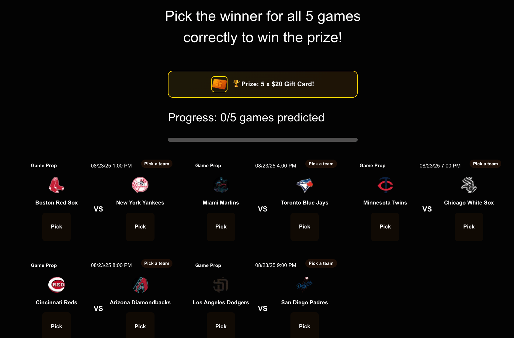 All you have to do is choose the winning team for a slate of weekend games. Five players who nail all of their picks will get a $20 gift card of their choosing sent straight to their email.
