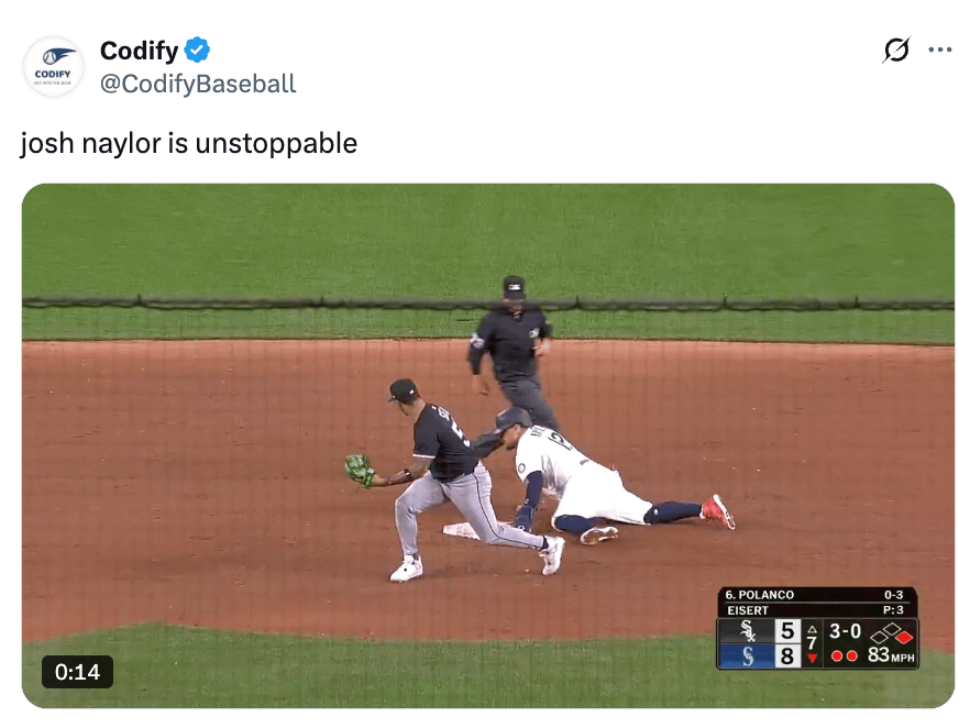 Why it matters: Naylor is proving that you don’t actually need to be that fast to steal bases in Major League Baseball. He’s run on Gold Glove catchers, swiped third base five times, and has a 92% success rate on the year. For a guy who looks more like he should be stealing fries off a teammate’s plate than bases, it’s equally hilarious and impressive.