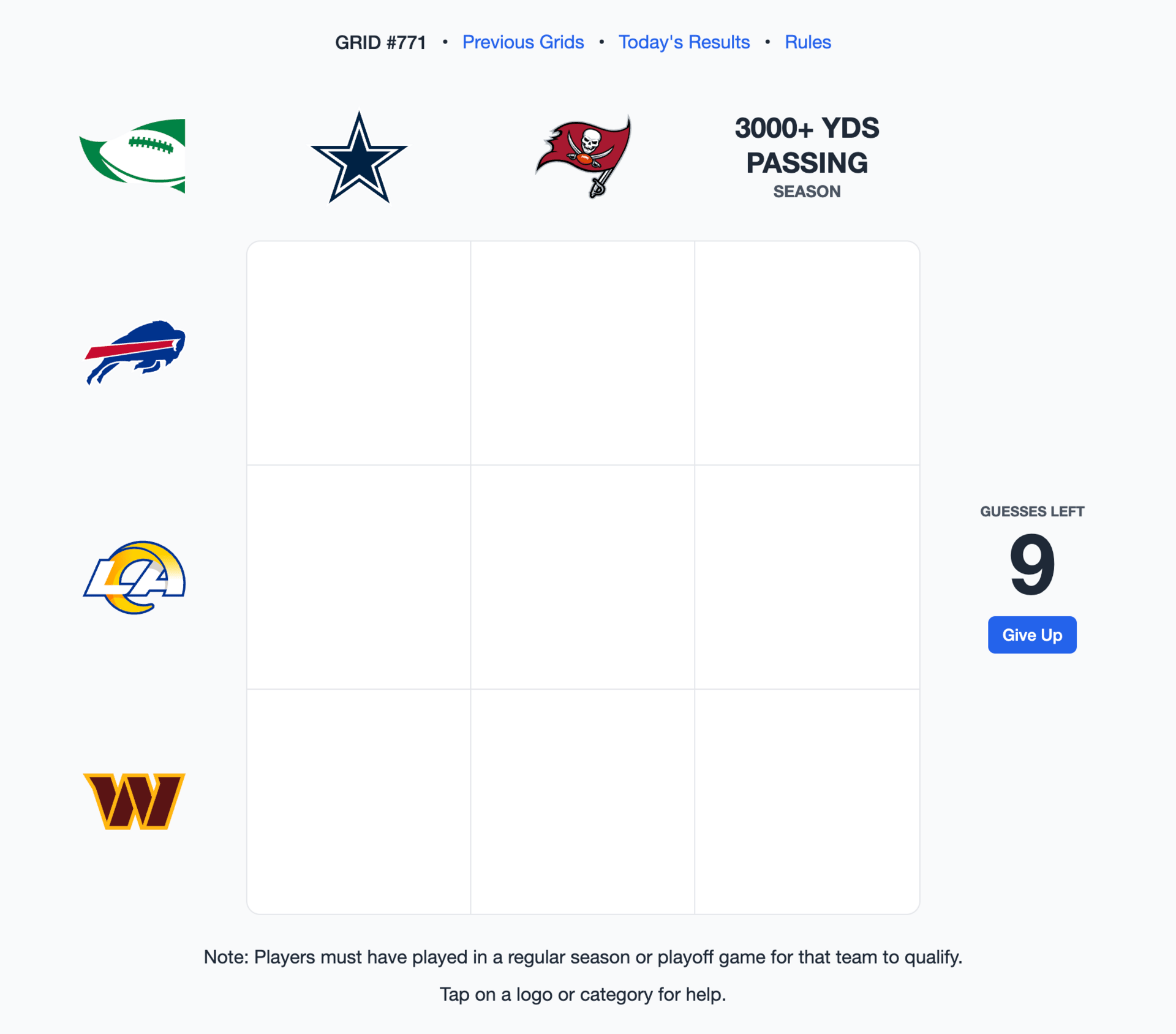 Select a player for each cell that matches the criteria for that cell’s row and column.You have nine guesses to fill out the grid.