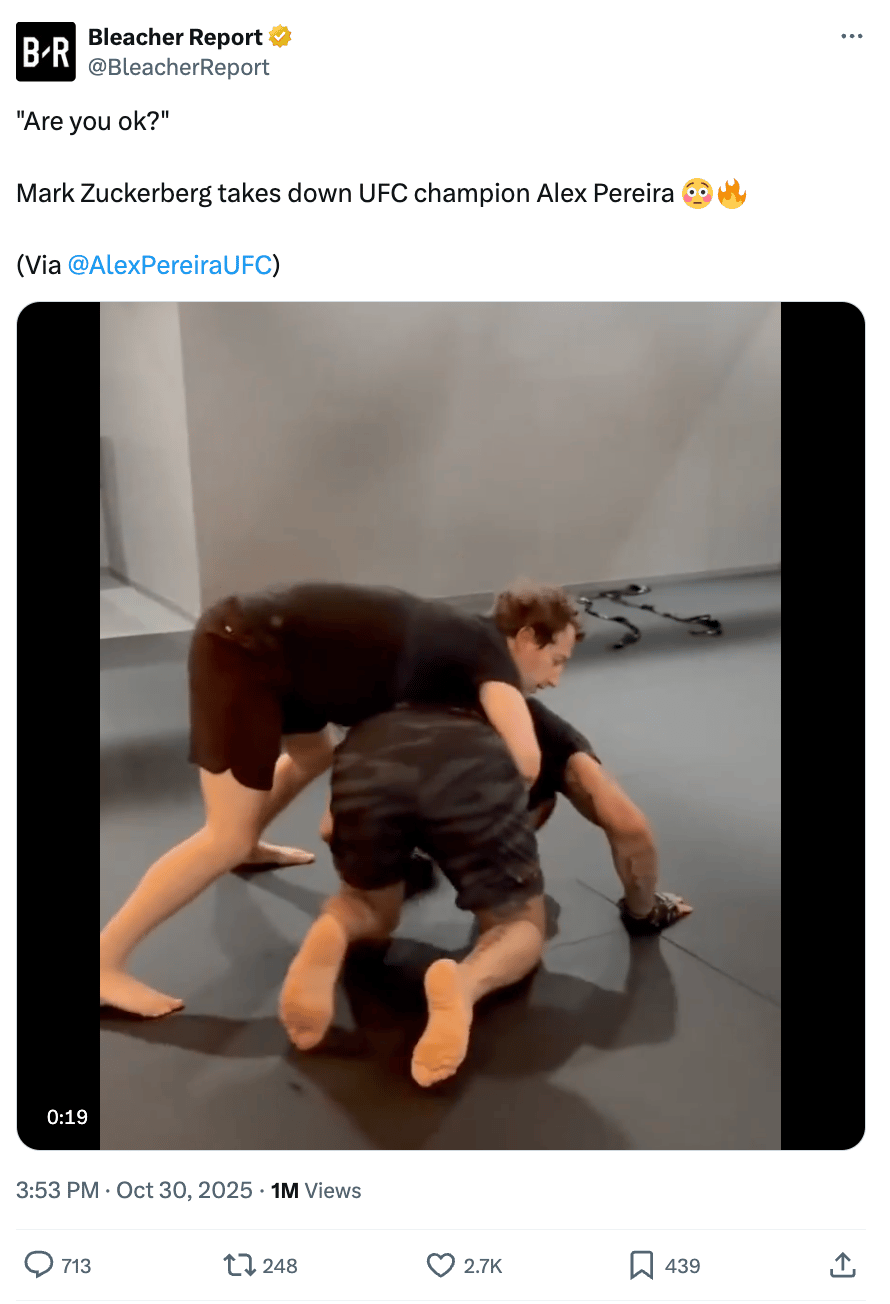 𤼠Mark Zuckerberg somehow took down UFC champion Alex Pereira. We know Zuckās been hitting the jiu-jitsu gym as part of his āI swear Iām coolā PR campaign, but thereās just zero chance this fight wasnāt fixed. Go get your bag Pereira, no judgement here.